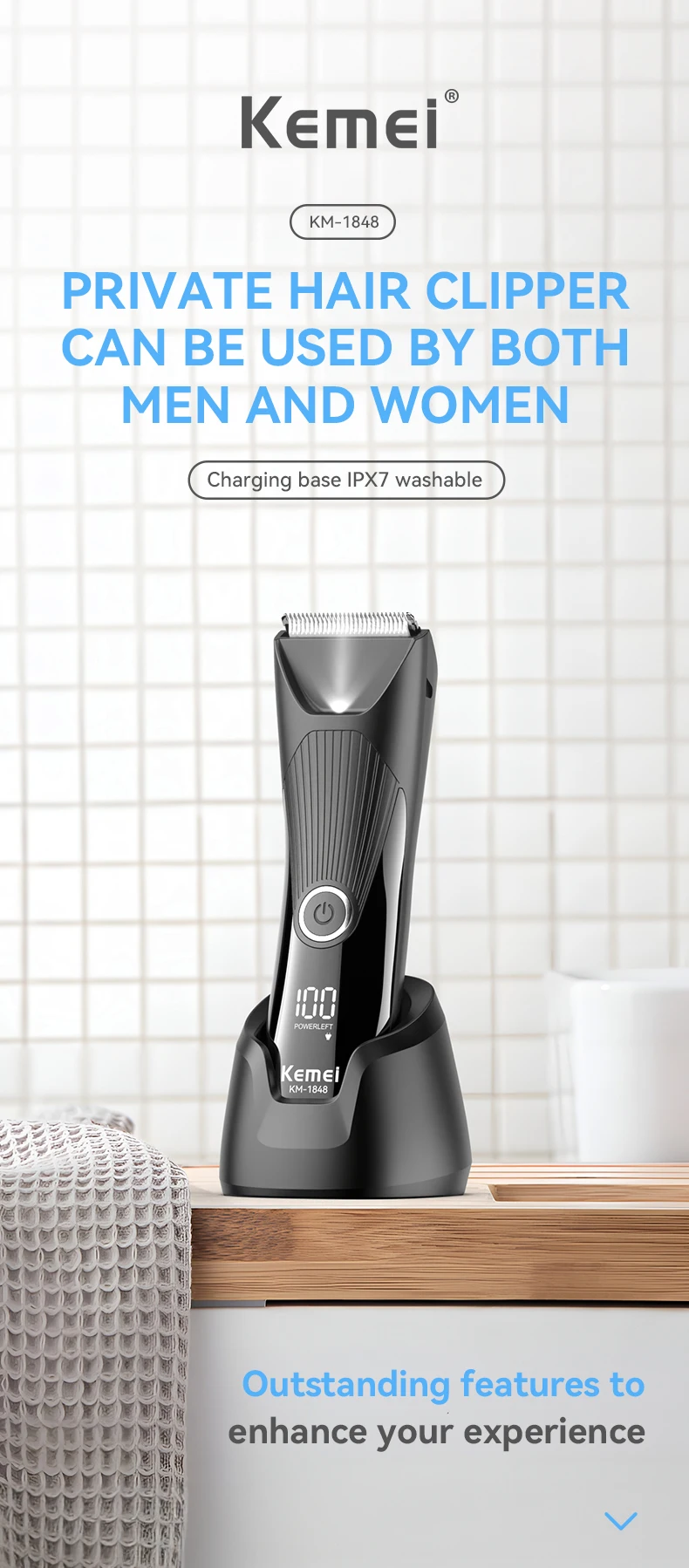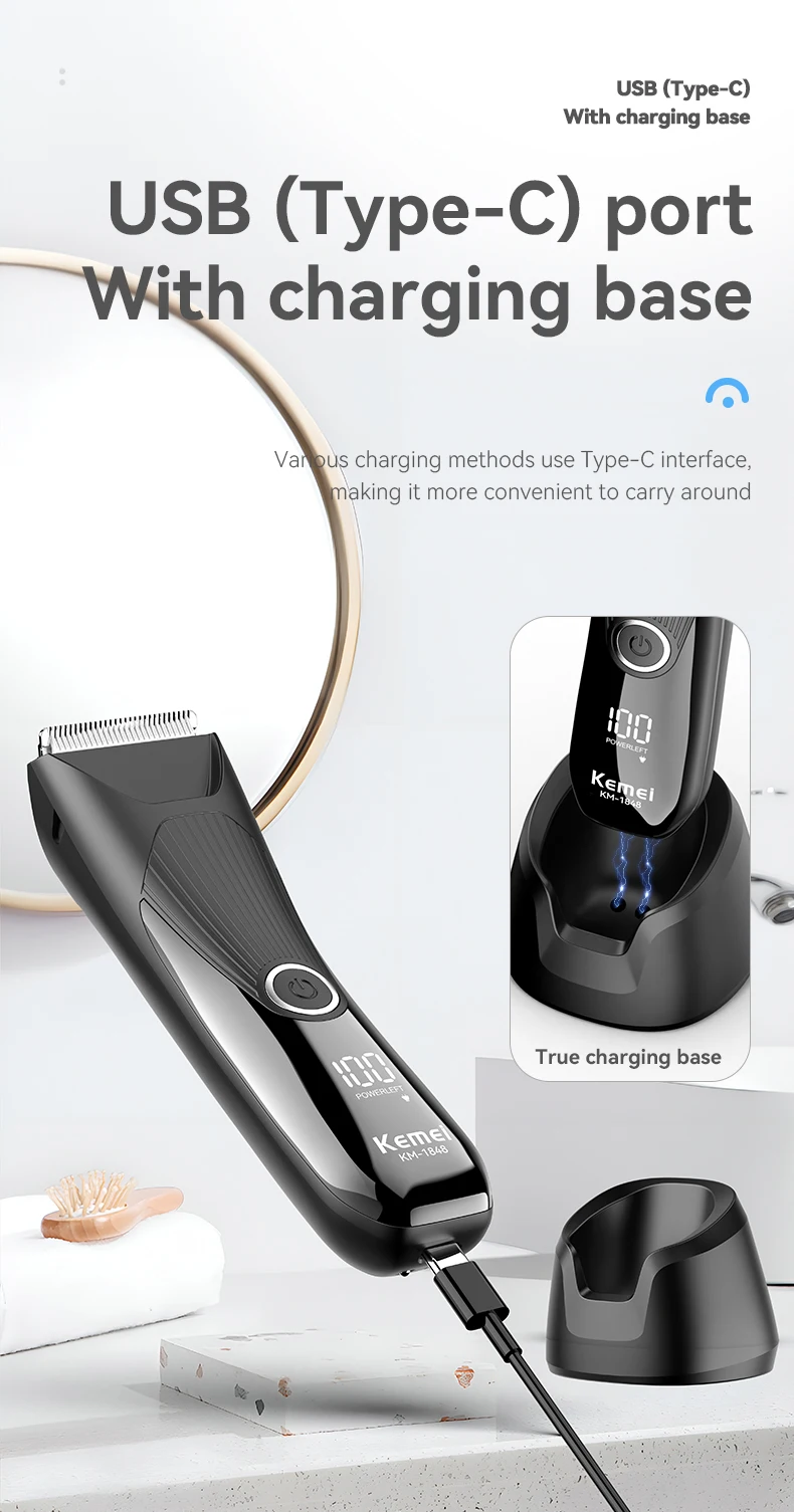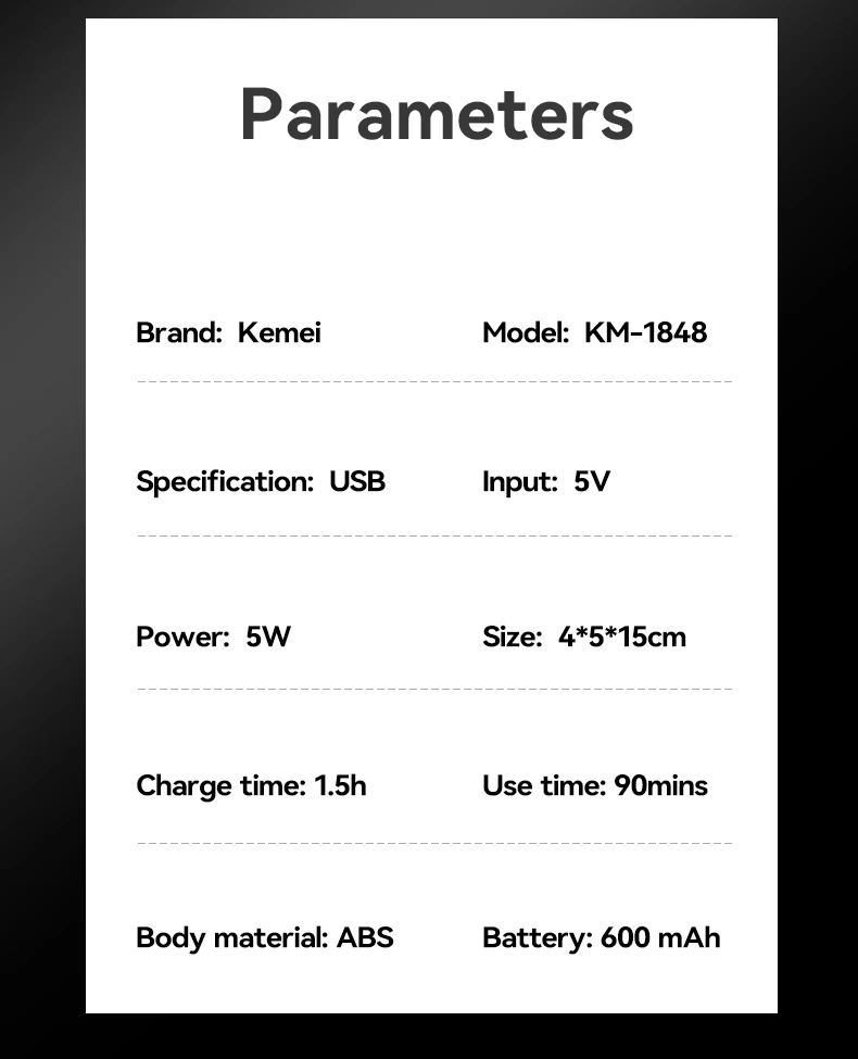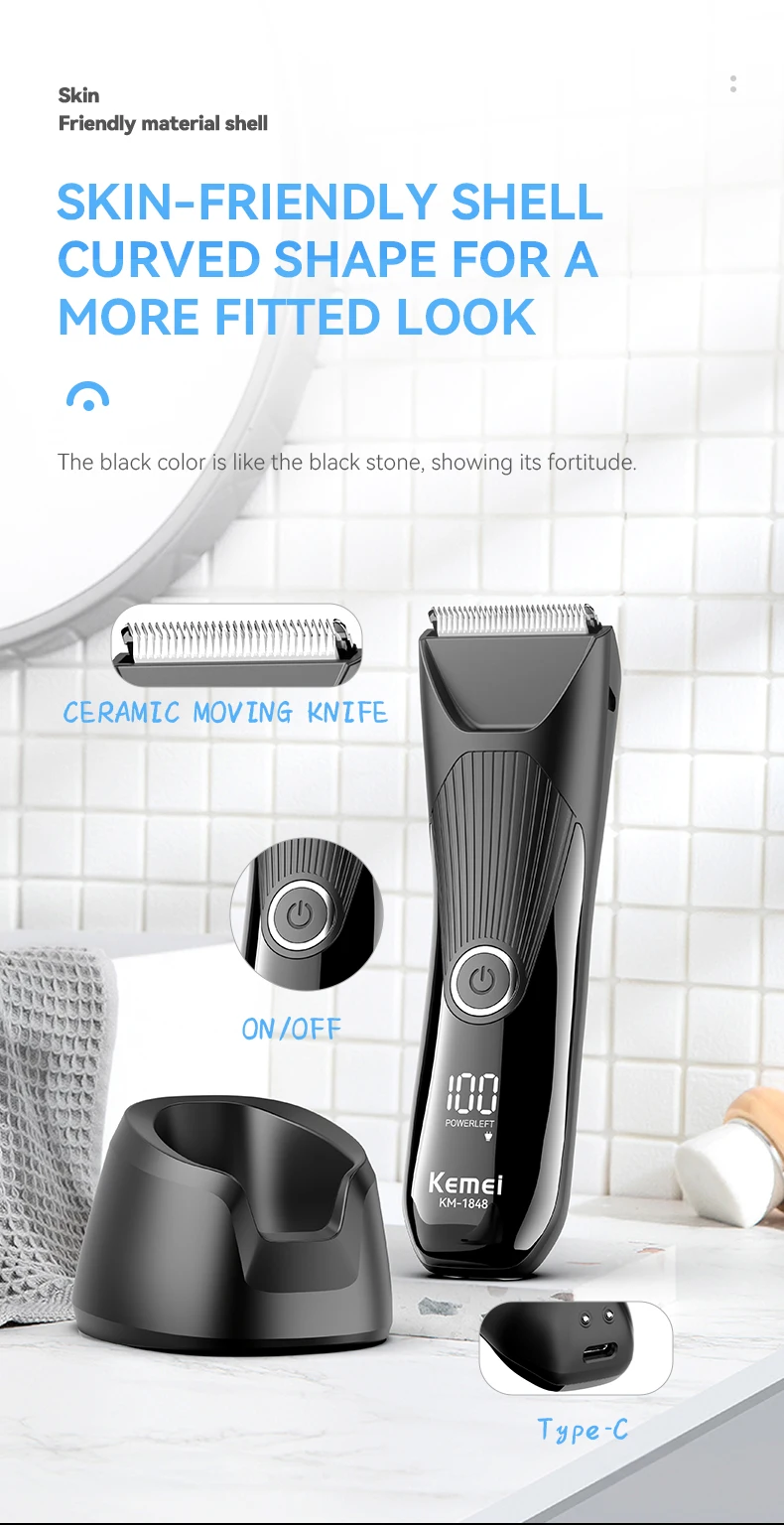 he Kemei KM-1848 is the perfect choice for those seeking maximum performance and safety in personal grooming Equipped with anti-cut technology and a high-precision ceramic blade, it prevents cuts and scratches, ensuring a smooth and comfortable trim.