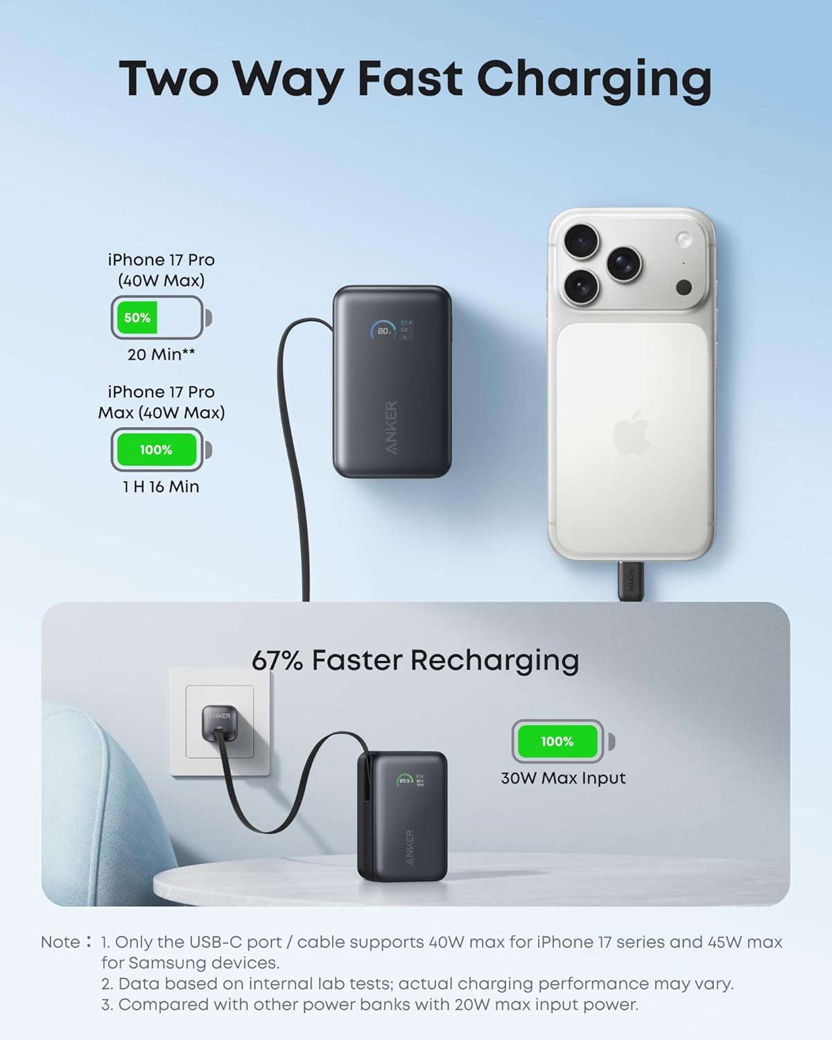 Rapid Self-Recharge: The power bank can be fully recharged in approximately 2 hours with a 30W or higher PD charger.