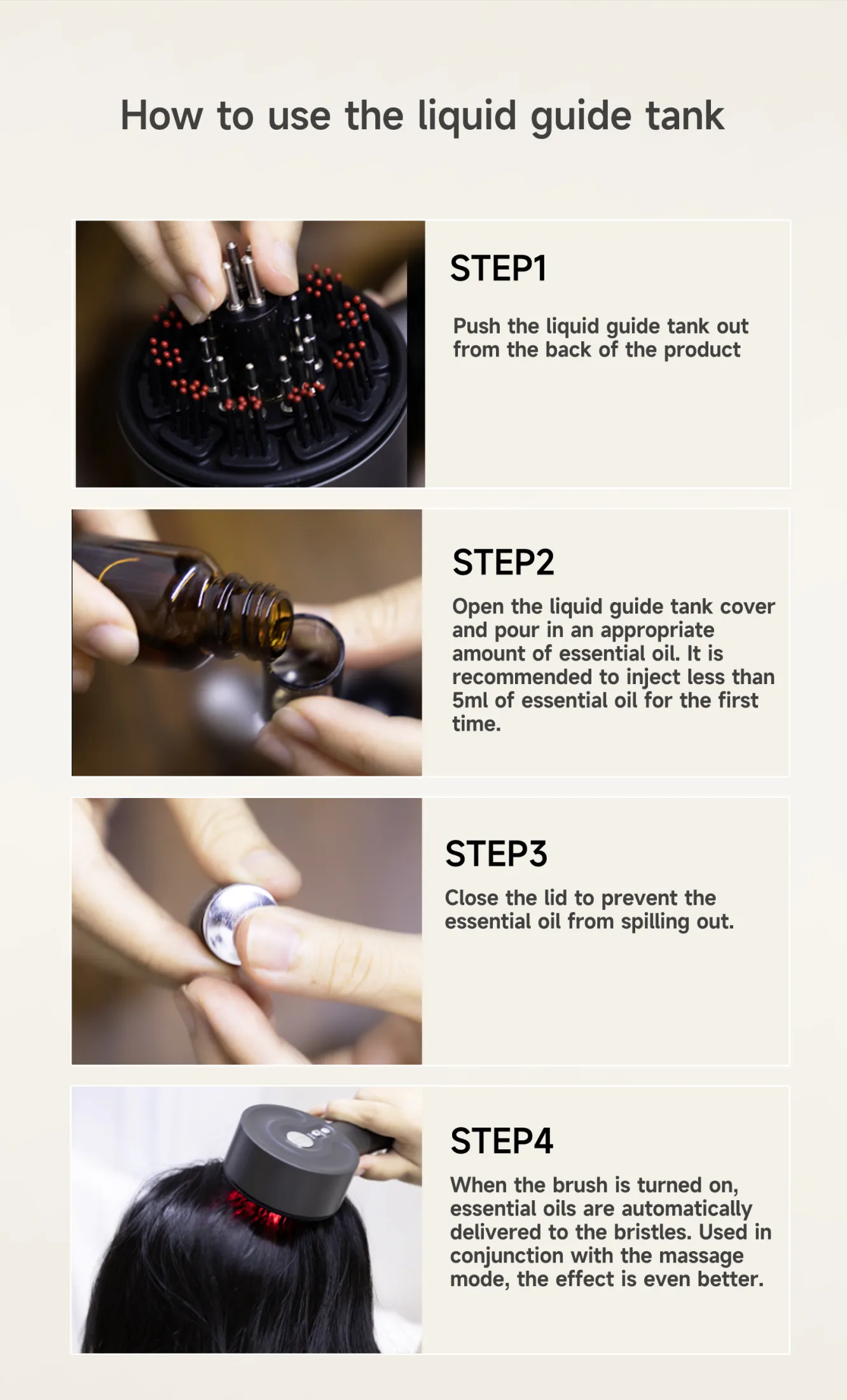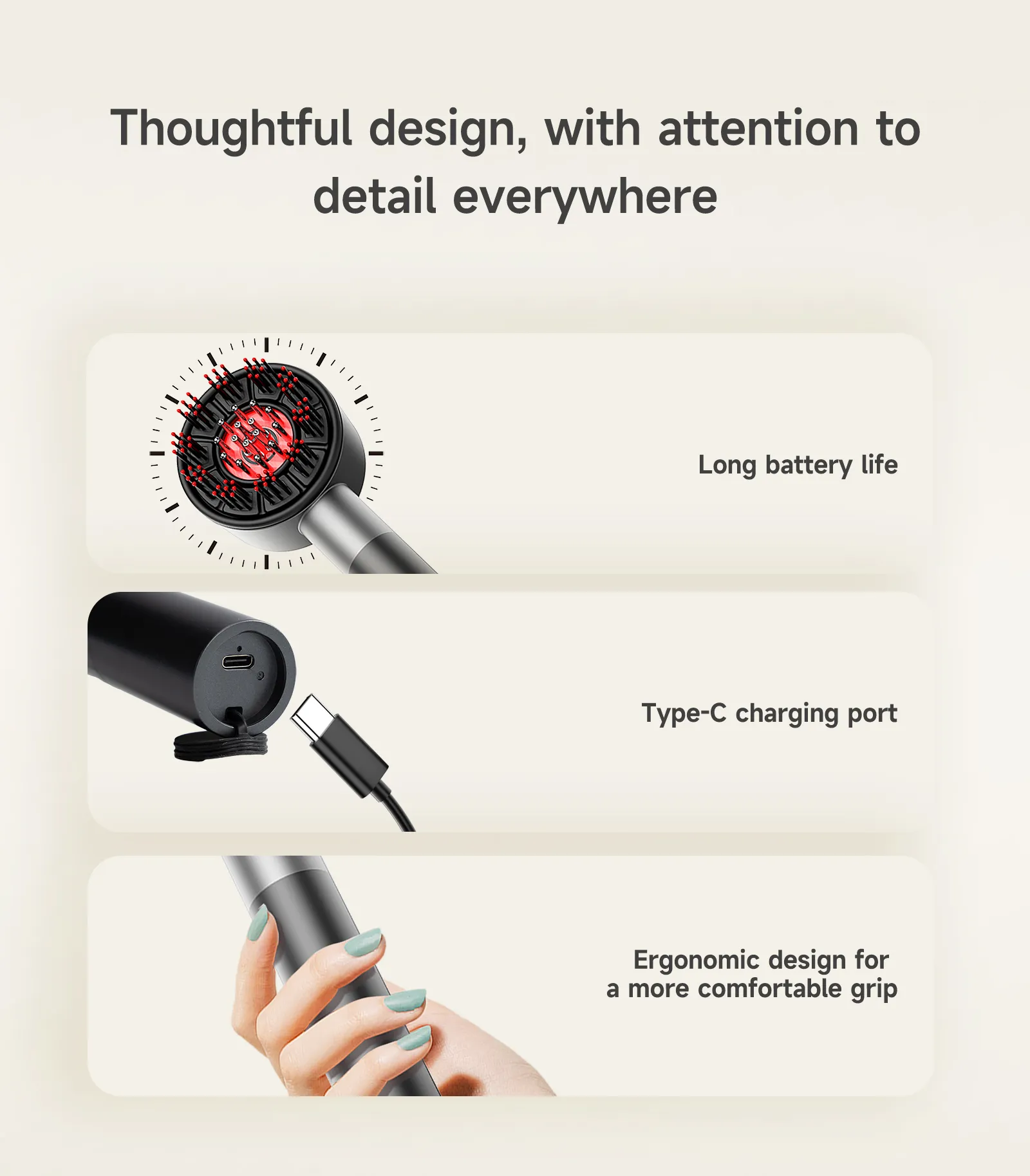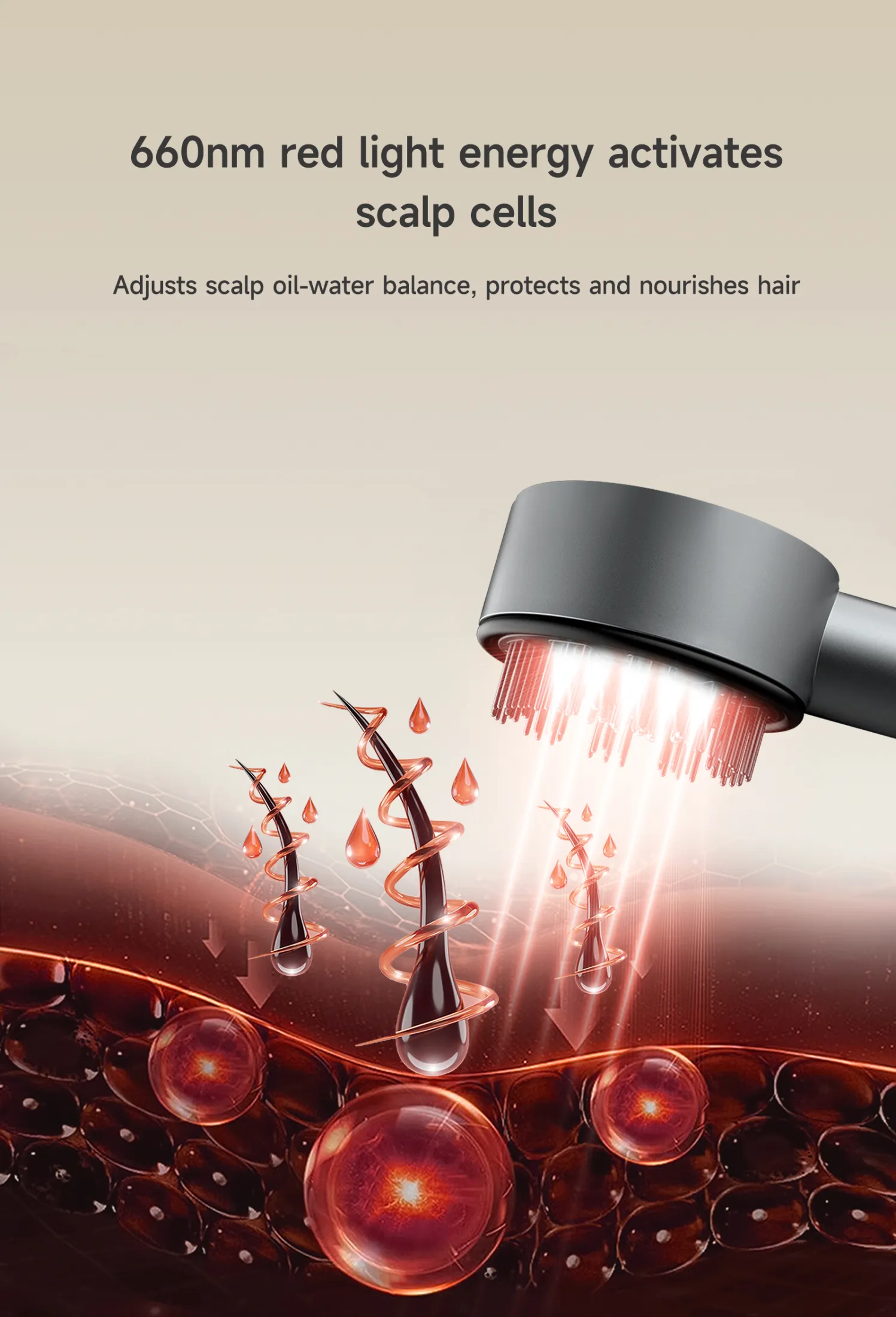 Experience the power of 660nm red light energy to: Stimulate scalp cells & boost blood circulation Balance oil production and improve follicle health Encourage stronger, shinier, and faster-growing hair.