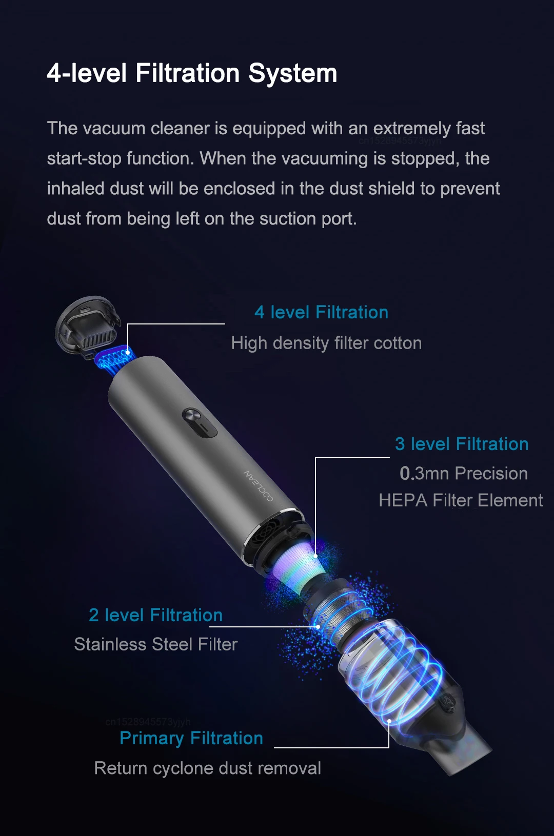- [4-level Filtration System]The vacuum cleaner is equipped with an extremely fast start-stop function. When the vacuuming is stopped, the inhaled dust will be enclosed in the dust shield to prevent dust from being left on the suction port.