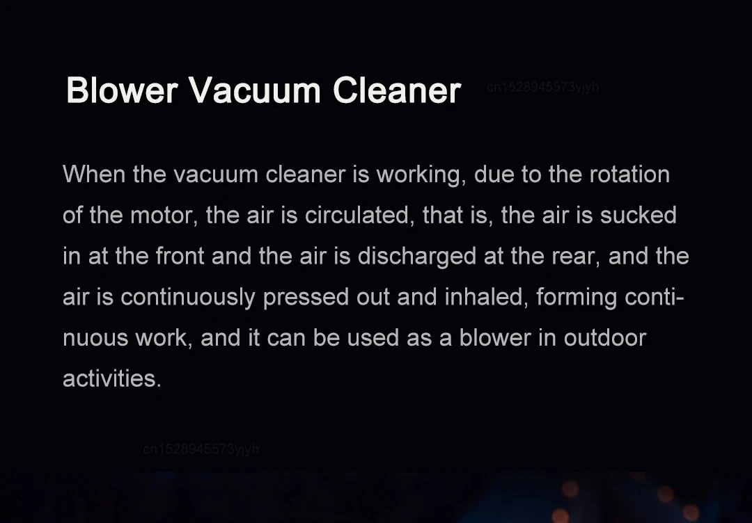 - [Blower Vacuum Cleaner]When the vacuum cleaner is working, due to the rotation of the motor, the air is circulated, that is, the air is sucked in at the front and the air is discharged at the rear, and the air is continuously pressed out and inhaled, forming continuous work, and it can be used as a blower in outdoor activities.